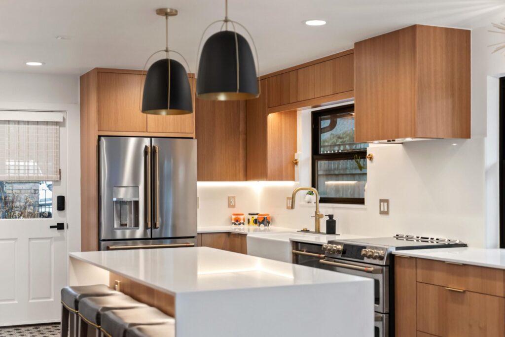 Our call: Renovation. Reface the cabinet boxes with new doors and drawer fronts, install quartz counters, add a new backsplash, update the hardware, and swap the faucet and pendant lights. You keep the layout that already works and avoid permits entirely.