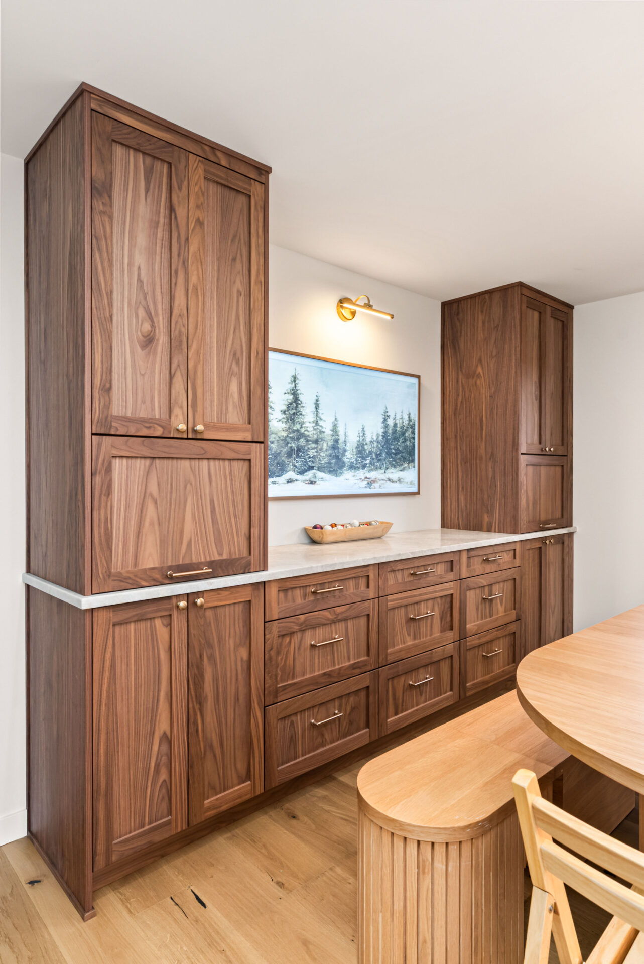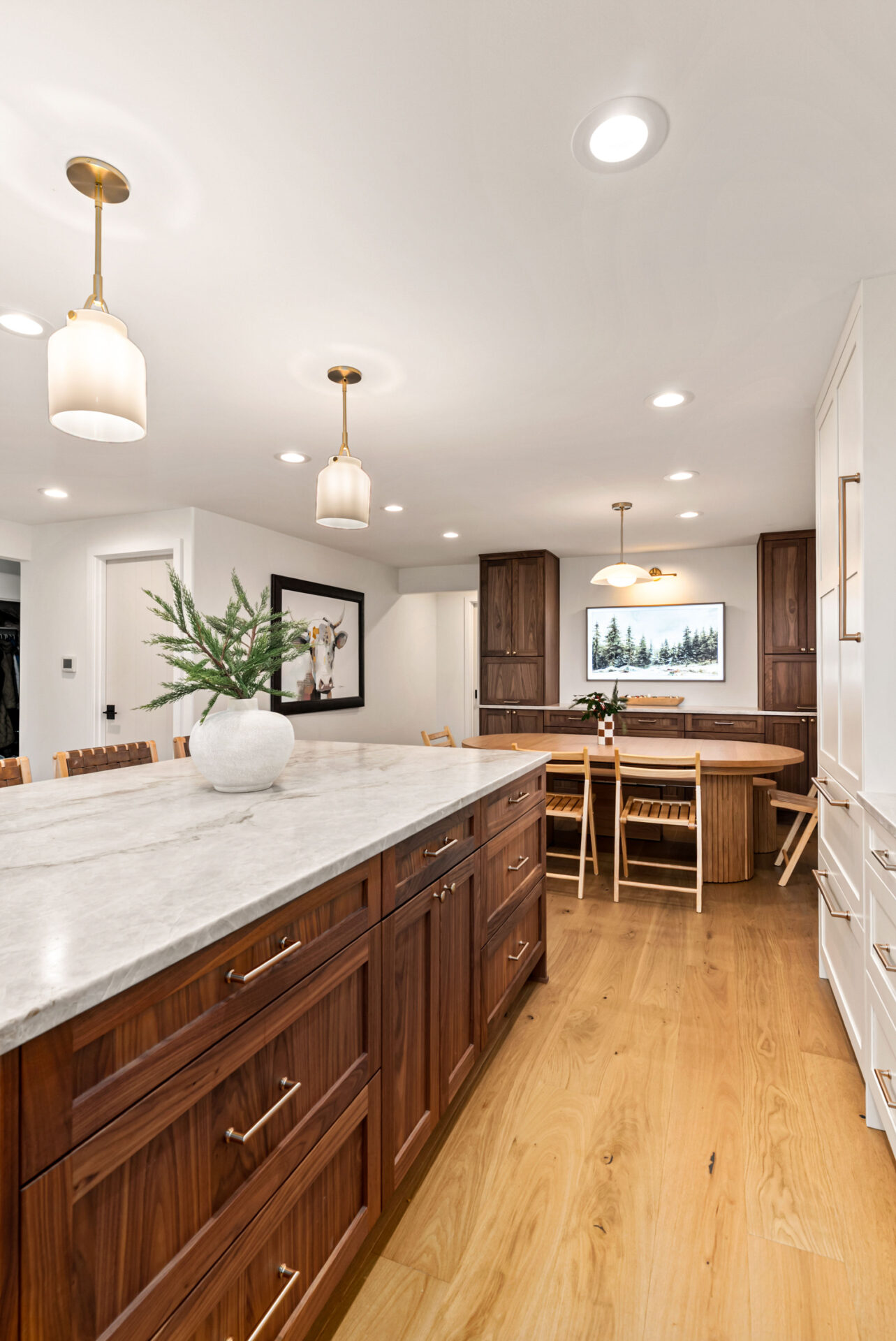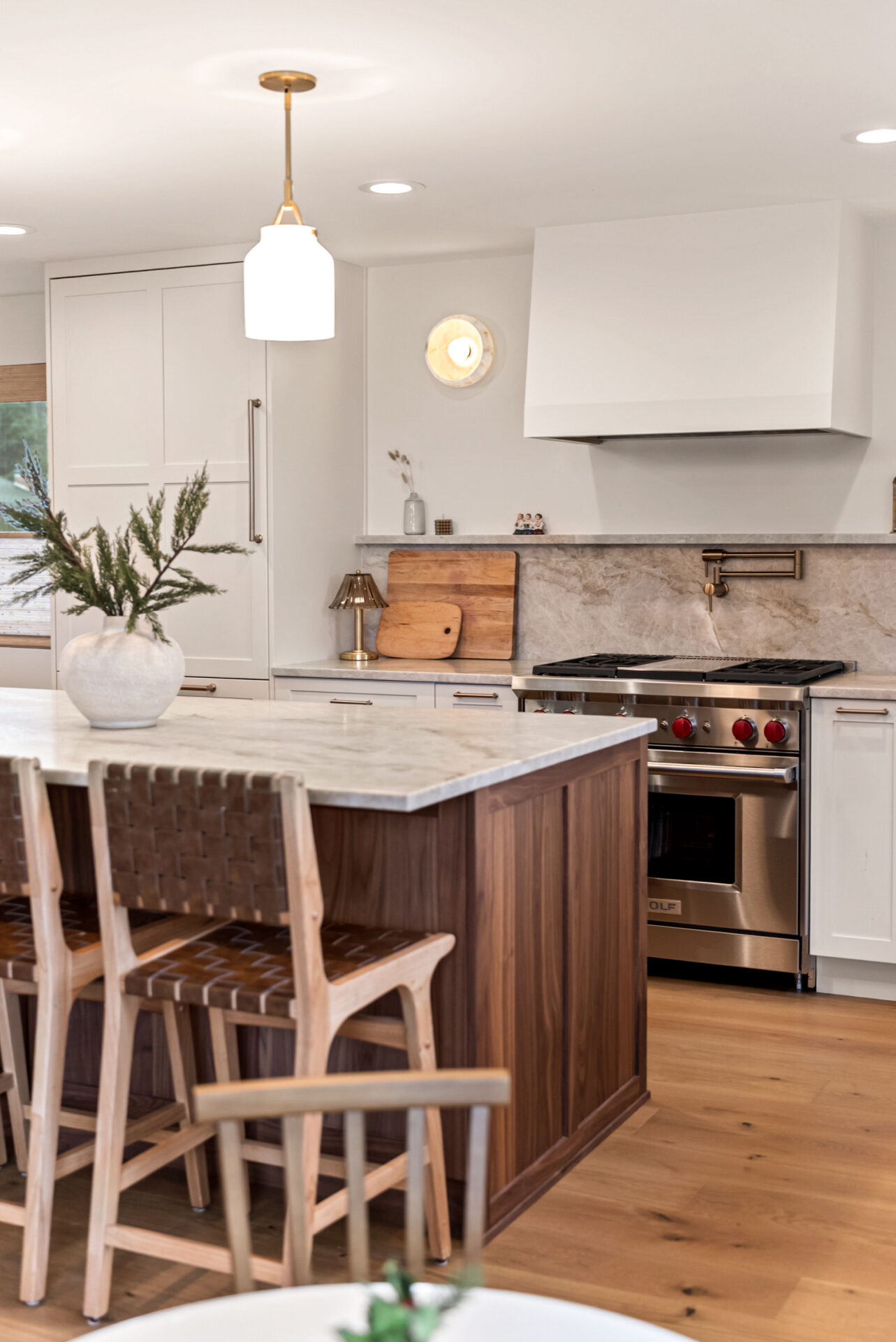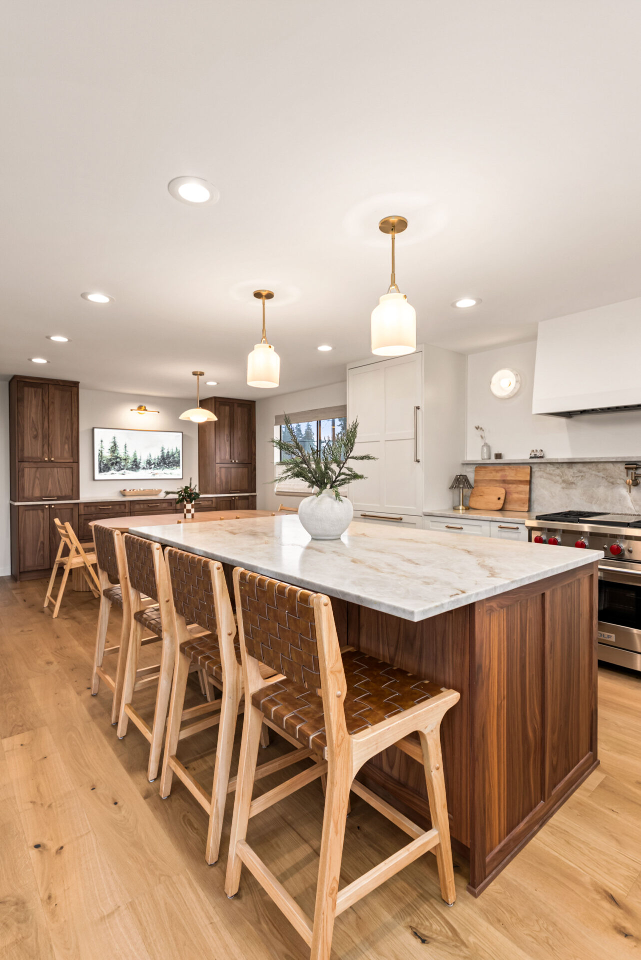 Natural walnut cabinetry was used for the island and bar area to introduce warmth and depth, while alabaster white cabinets were selected for the perimeter to keep the space bright and visually open.Design Balance: