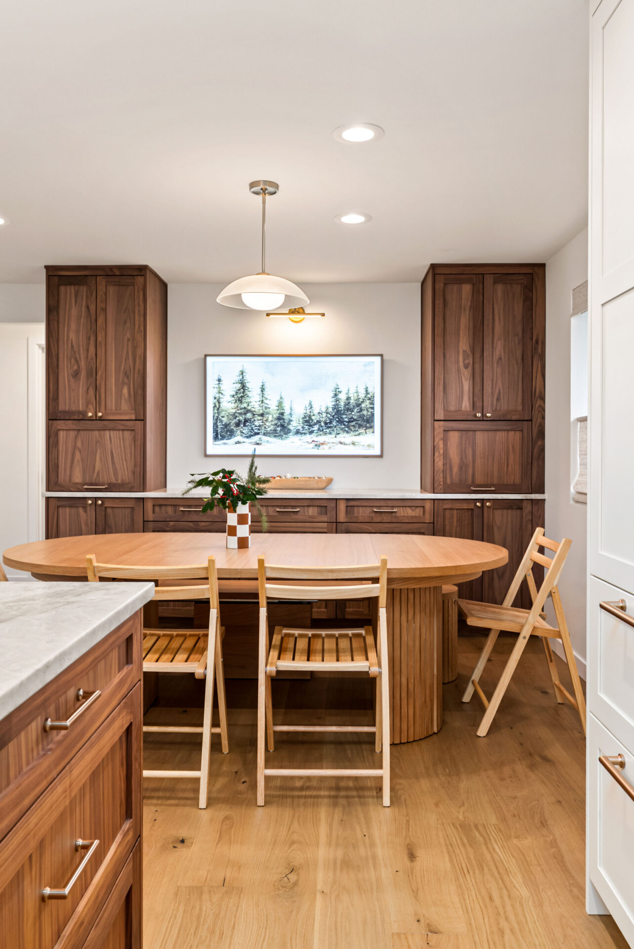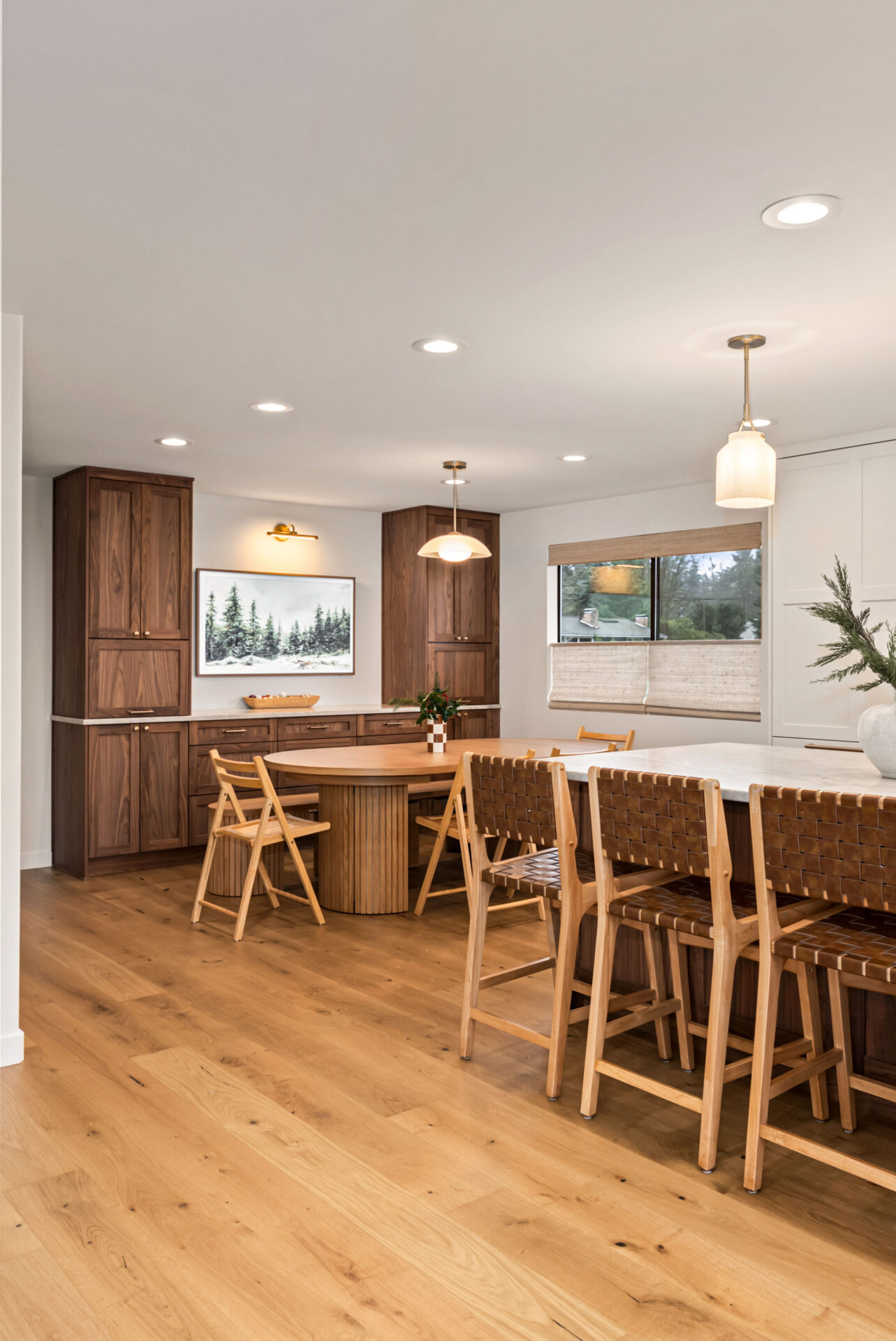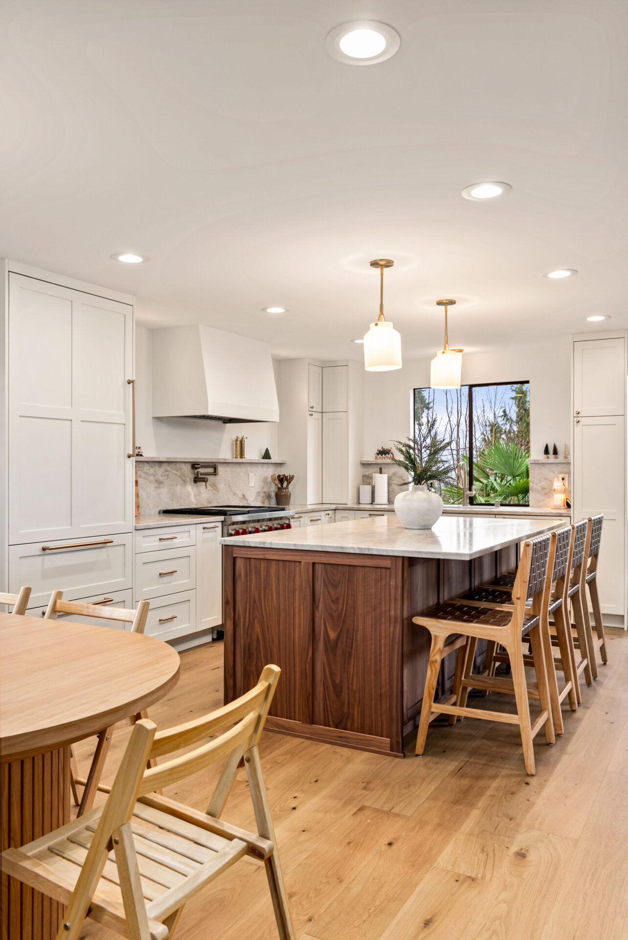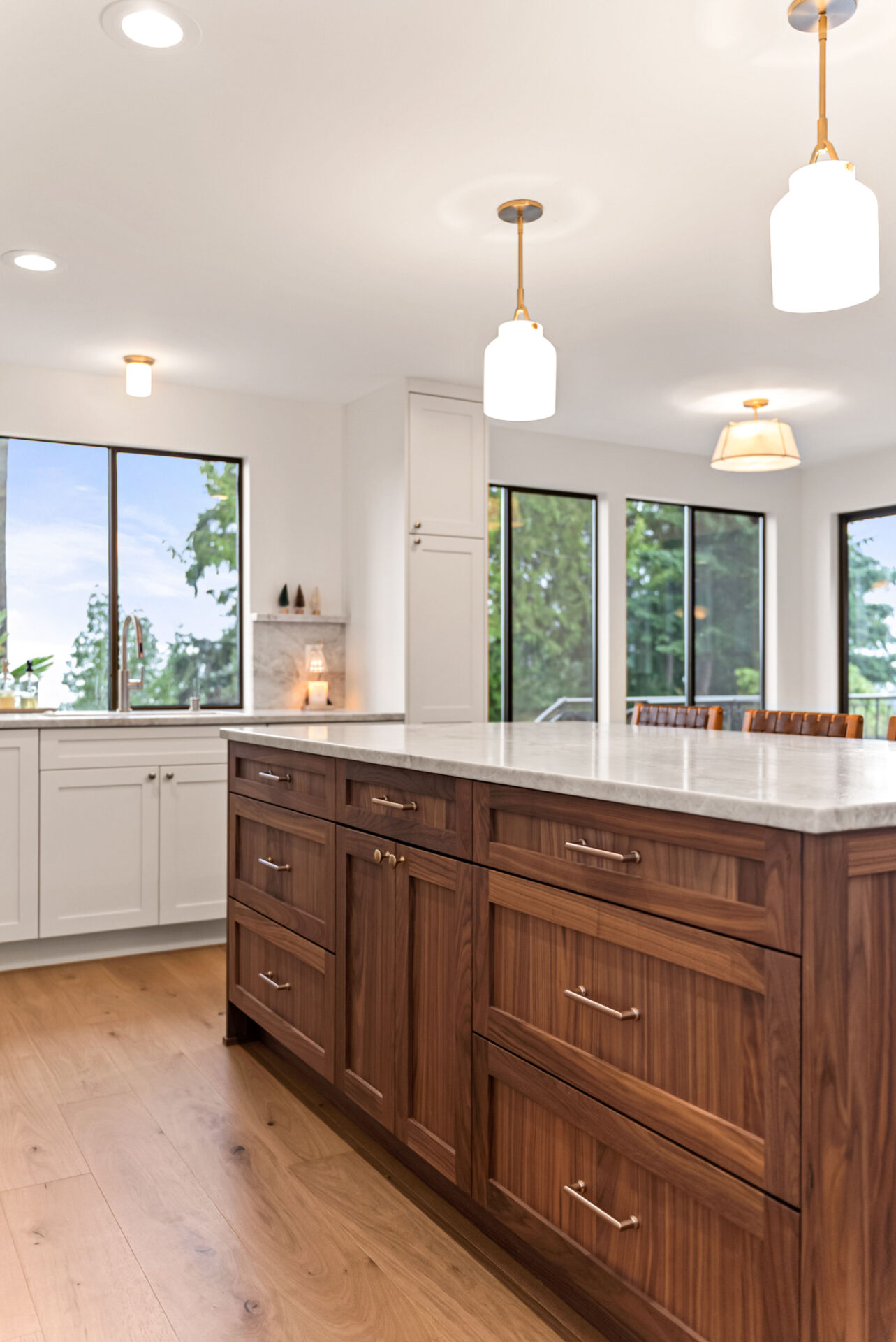 Natural walnut cabinetry was used for the island and bar area to introduce warmth and depth, while alabaster white cabinets were selected for the perimeter to keep the space bright and visually open.Design Balance: