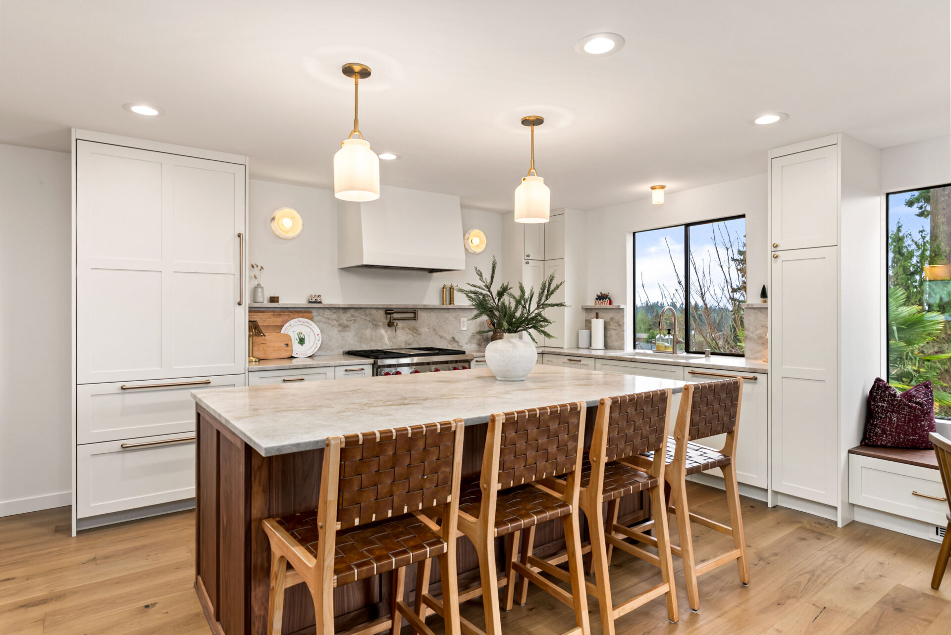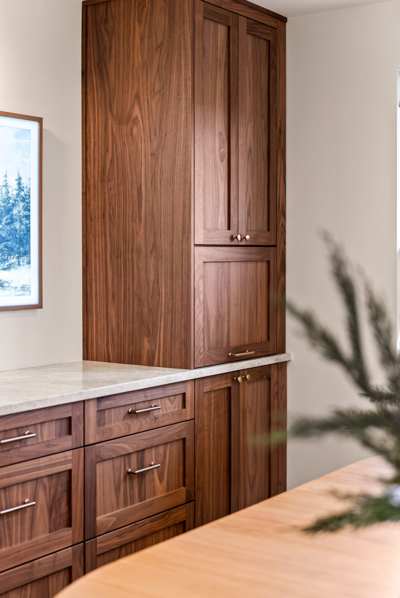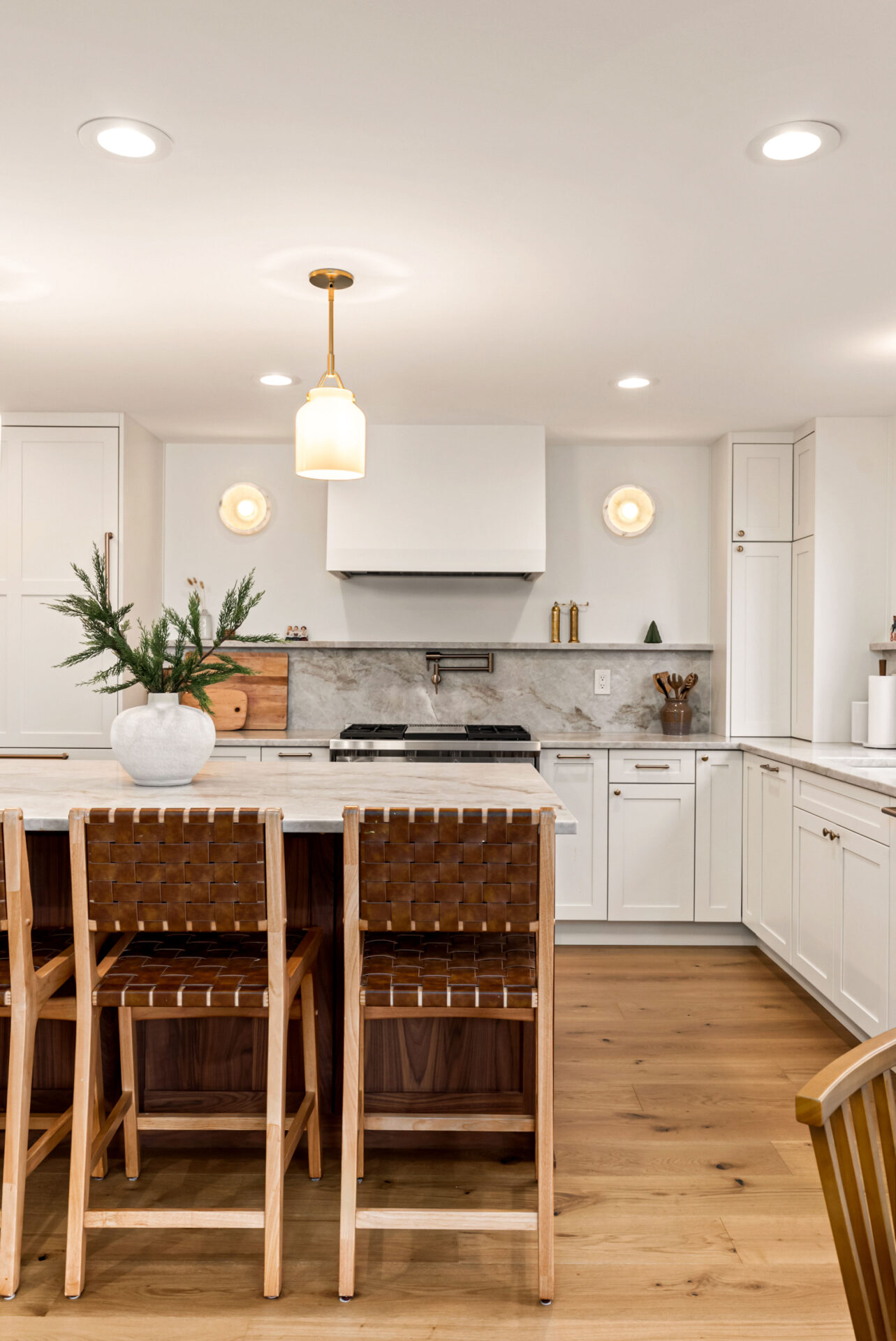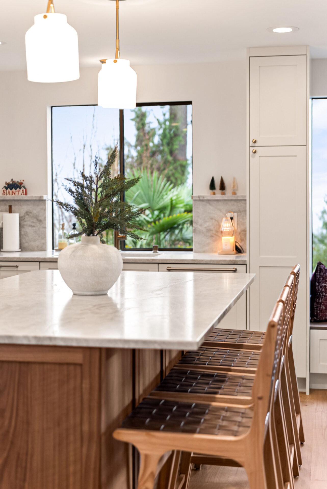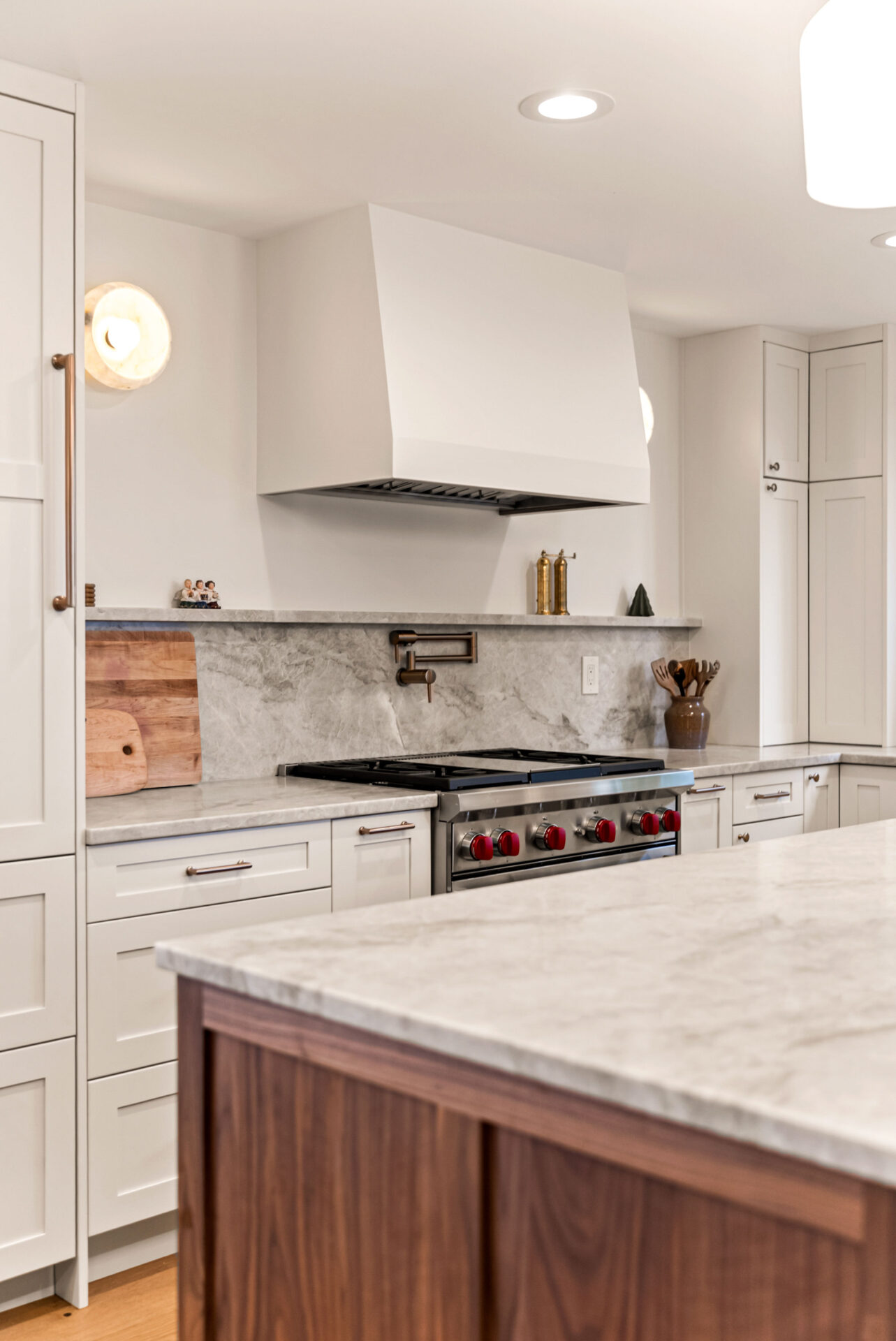 Natural walnut cabinetry was used for the island and bar area to introduce warmth and depth, while alabaster white cabinets were selected for the perimeter to keep the space bright and visually open.Design Balance: