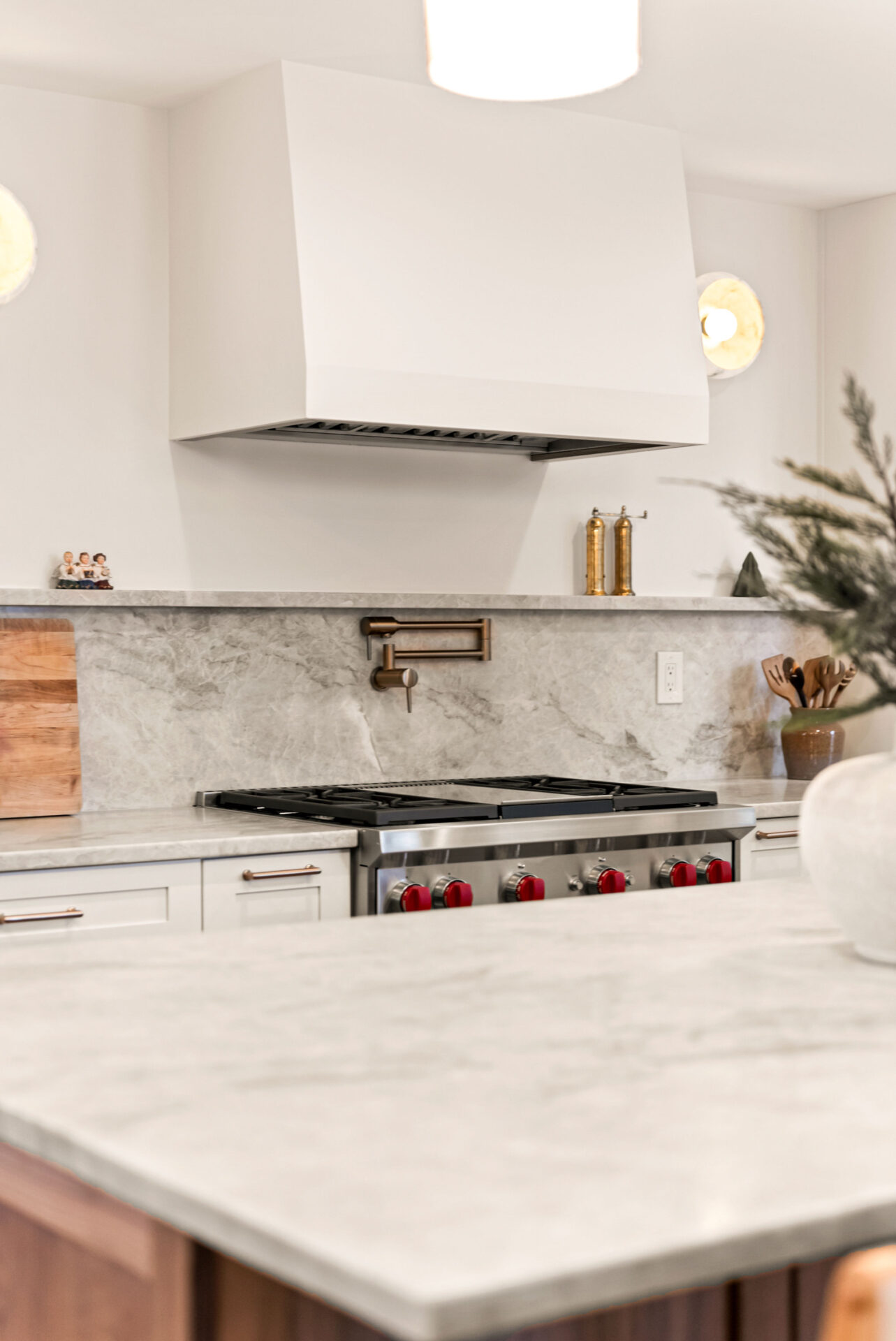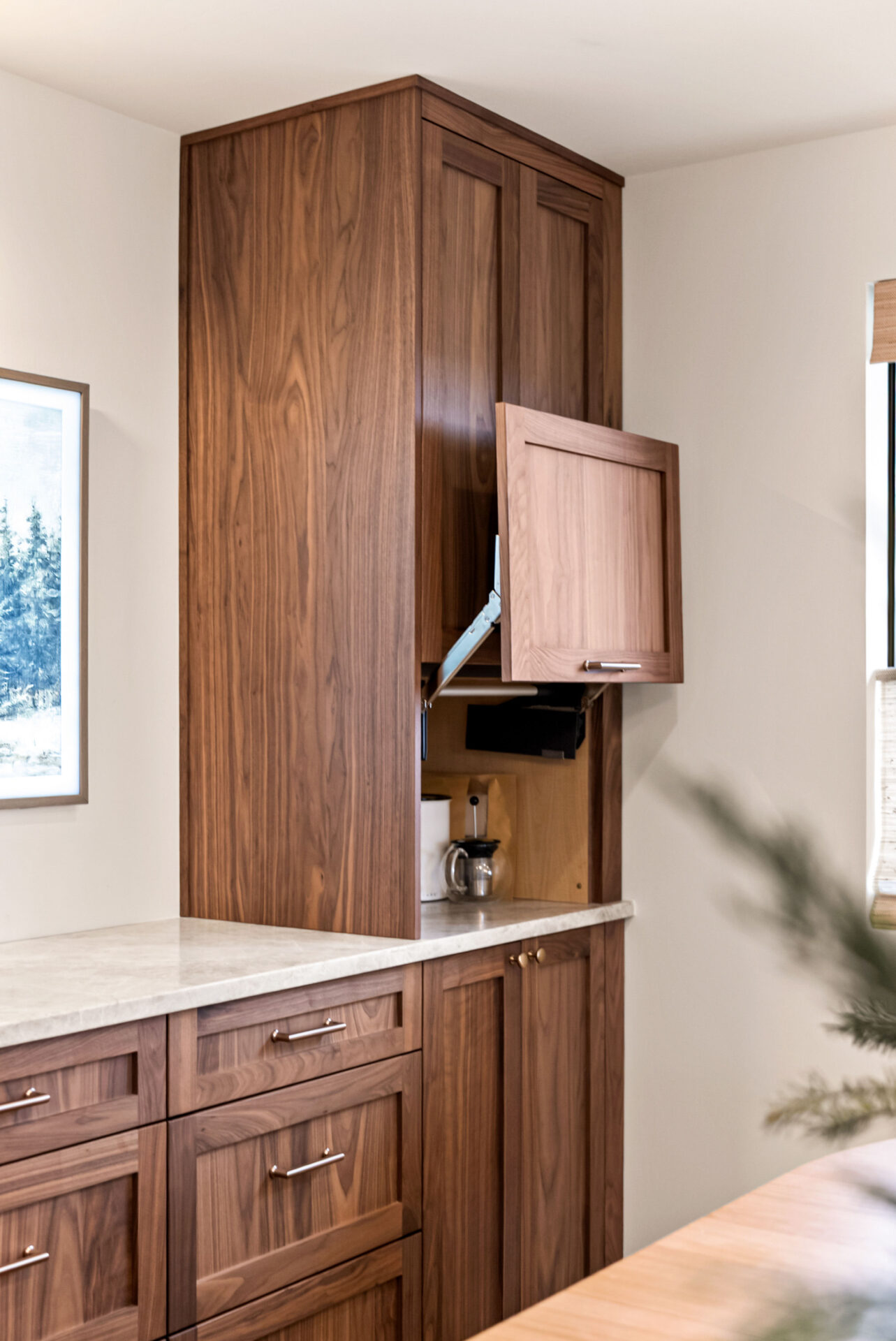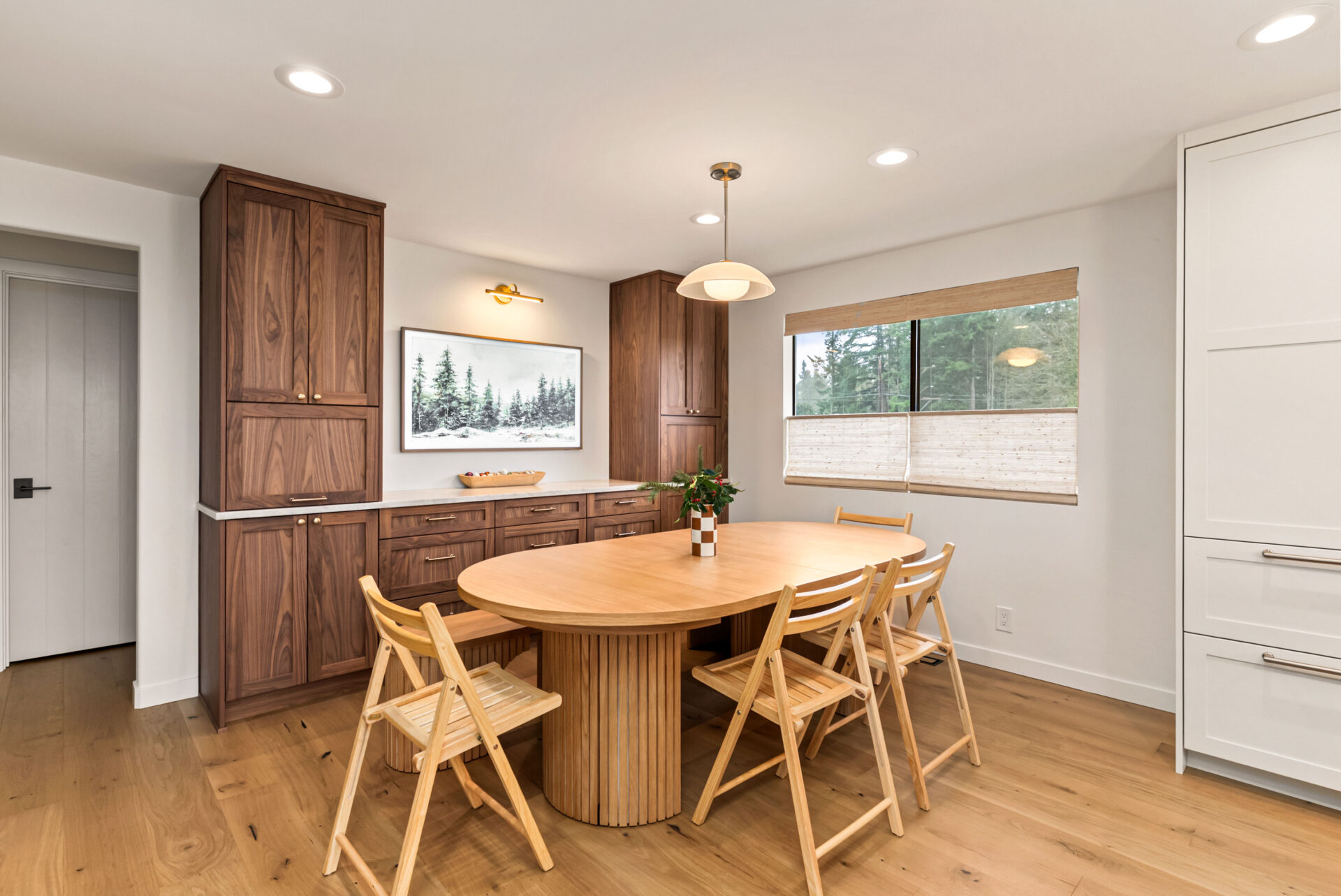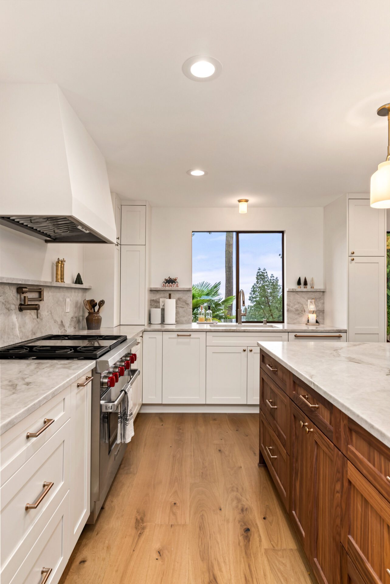 Natural walnut cabinetry was used for the island and bar area to introduce warmth and depth, while alabaster white cabinets were selected for the perimeter to keep the space bright and visually open.Design Balance: