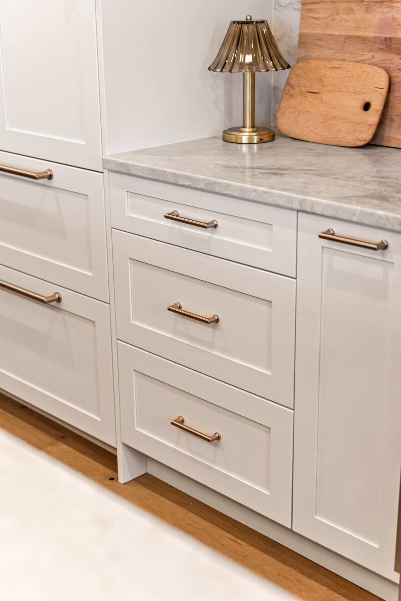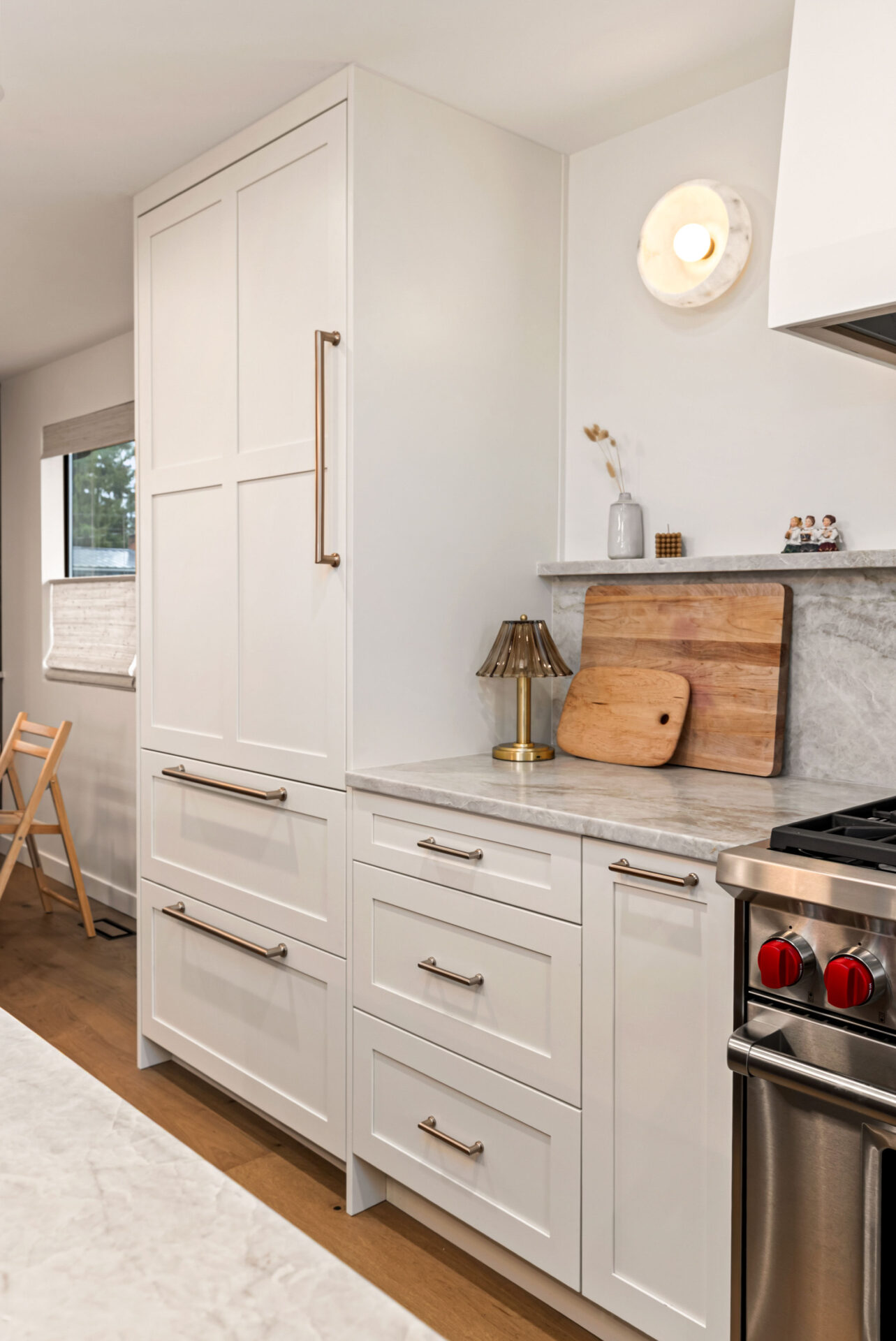 The foundation of this kitchen is Bellmont — a semi-custom cabinetry line chosen for its flexibility, precision, and ability to integrate panel-ready appliances seamlessly.
