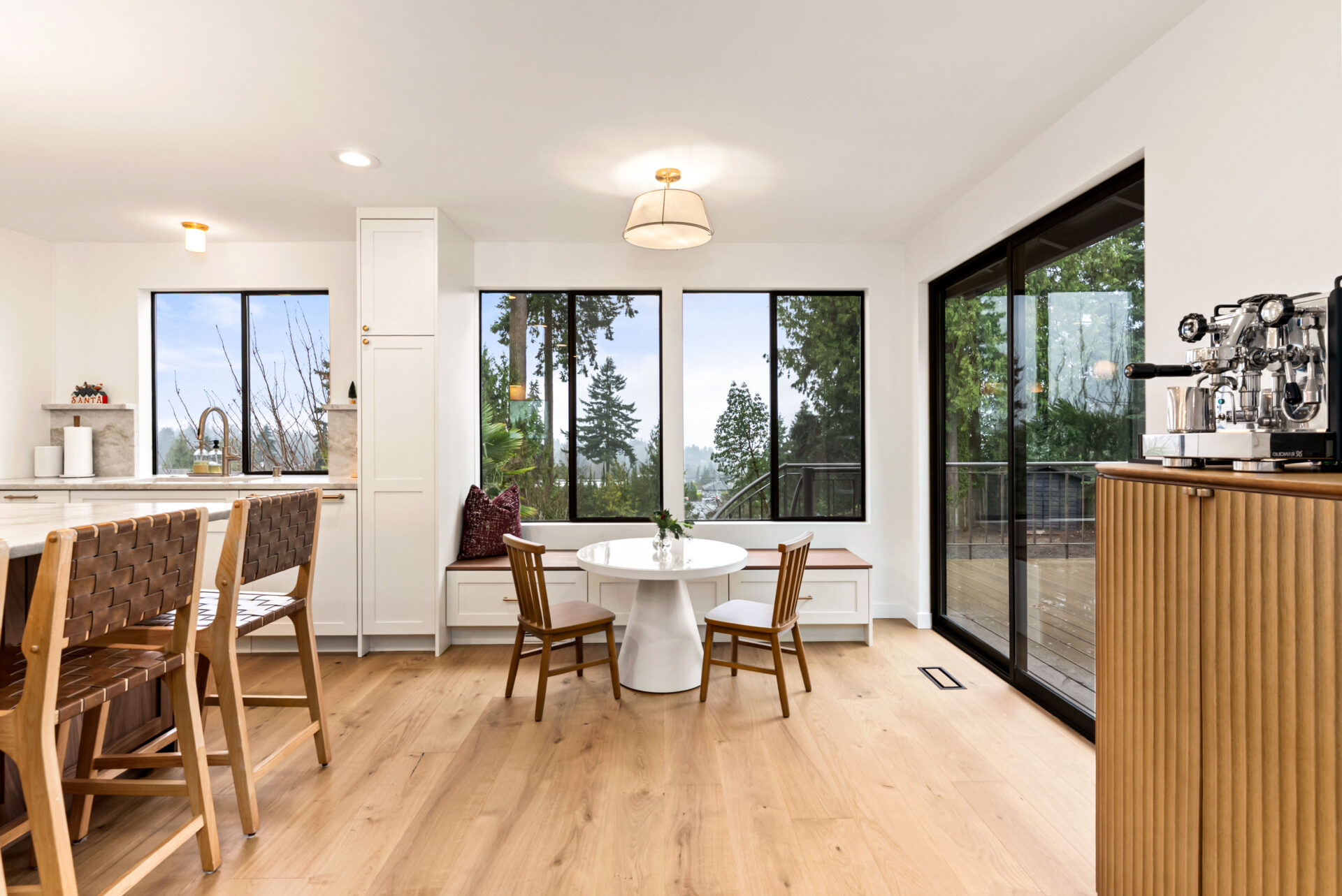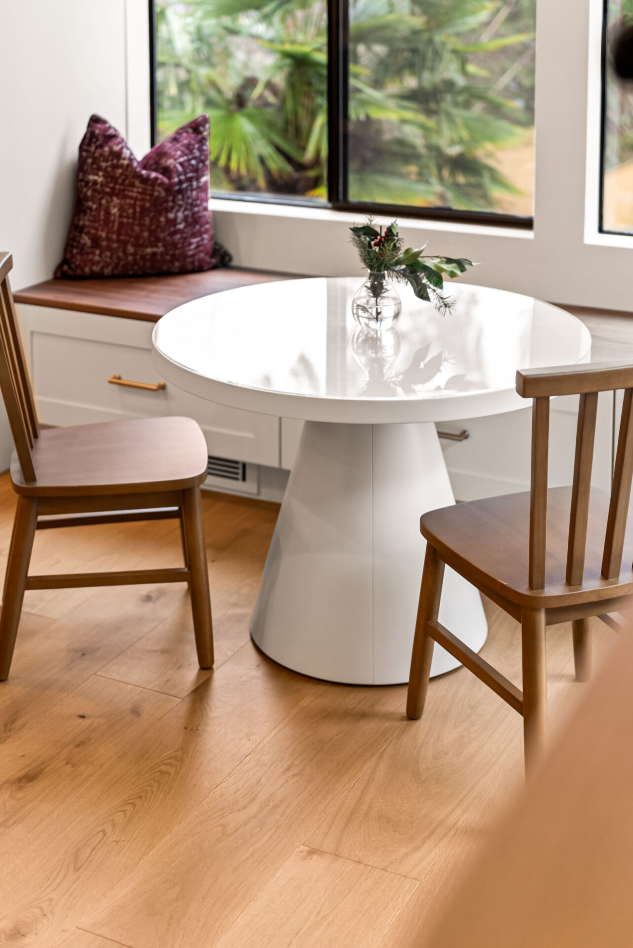 Custom seating bench by the window, creating a cozy spot for morning coffee or casual gatherings