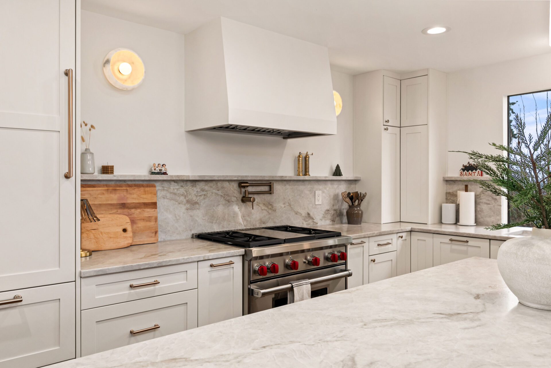 Semi-custom cabinetry allowed flexibility in sizing and seamless appliance integration without extending lead times.
