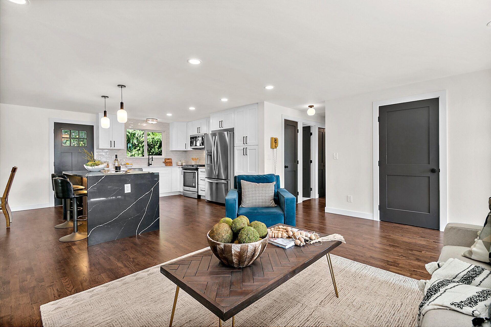 Pristine White Kitchen with Black and Brown Accents